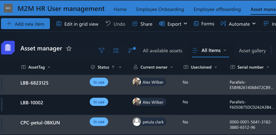 Daily Device updates maintained on SharePoint with flows to update assigned users.