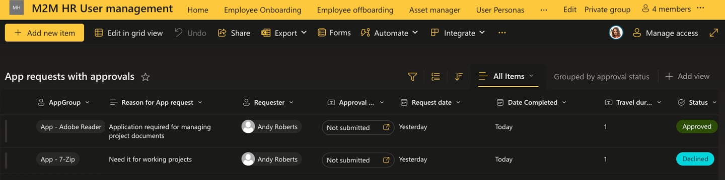 Application requests and approval. Customers still want an easy way for employees to raise application requests. Automate this through SharePoint, forms and automatic assignment to Intune using Email approval.